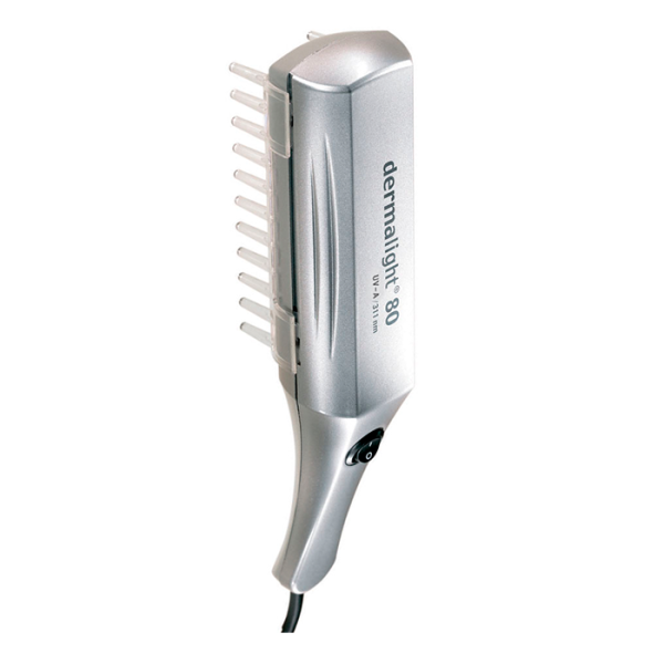 A DERMALIGHT 80 egy UV készülék fejbőrkezeléshez, levehető fésűvel, amely biztosítja a fejbőrtől való meghatározott távolságot és a hajszálak folyamatos szétválasztását, ezáltal megkönnyítve a különböző bőrproblémák célzott kezelését. A DERMALIGHT 80 választhatóan UV-A vagy UV-B hullámhosszal rendelkező sugárzással rendelkezhet, így számos indikáció kezelésére alkalmas. Könnyen kezelhető és tisztítható, így ideális lehet otthoni használatra is.